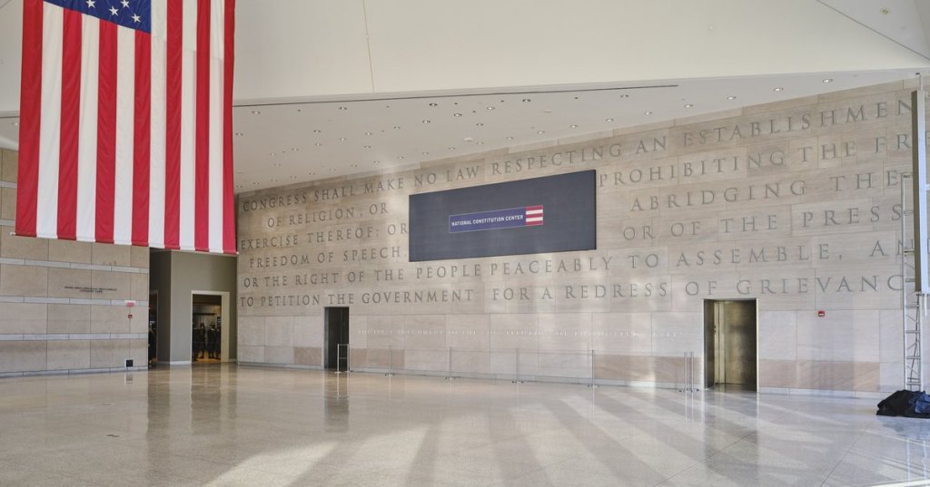 At the monument to the author of the First Amendment.
