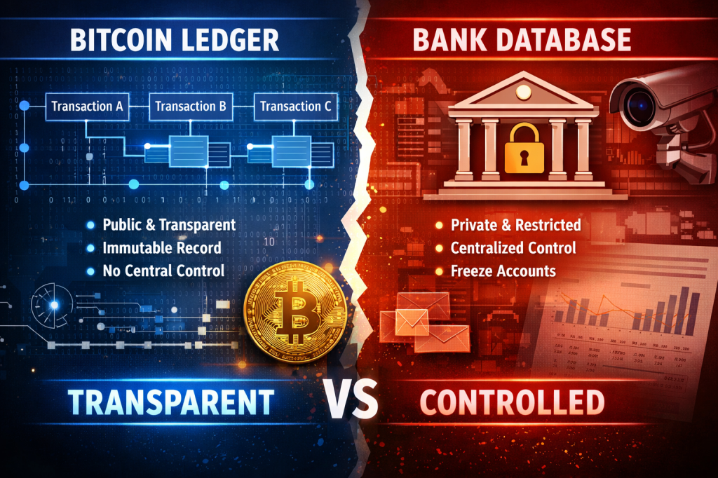 Bitcoin operates on a public, immutable ledger. Every transaction is permanently recorded and visible to anyone.