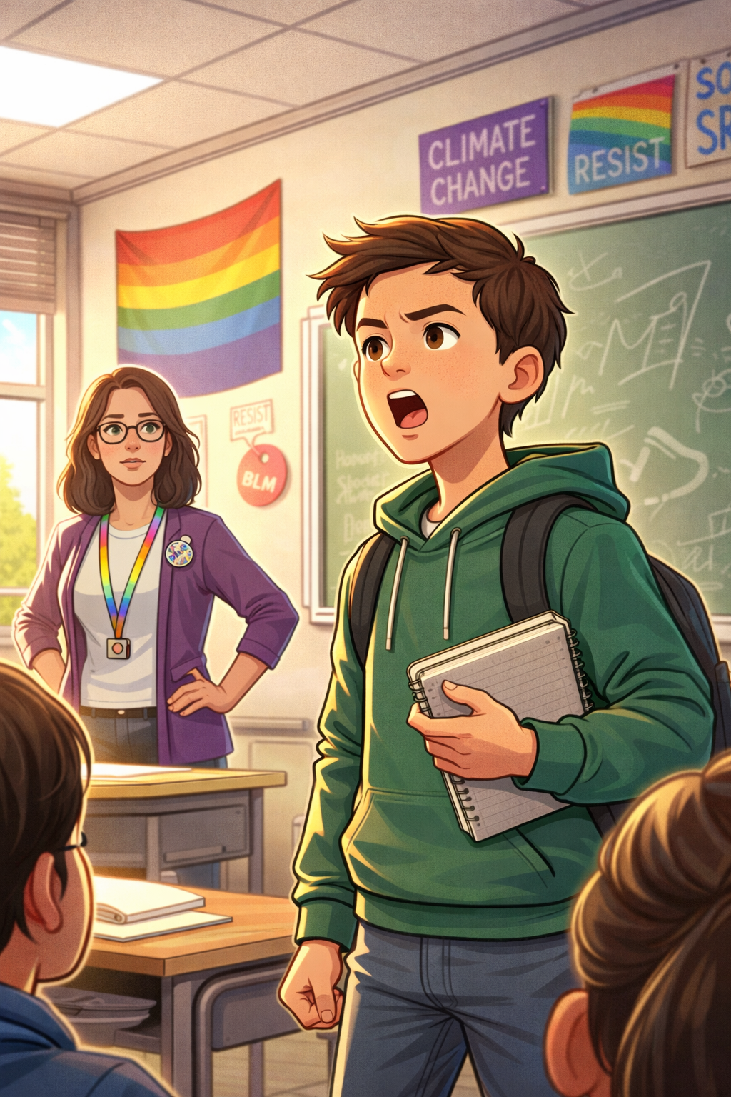 I’m not scared of you, Ms. Evergreen, or the teachers’ unions pushing this woke, divisive agenda that’s attacking young minds like ours. You should be ashamed of turning our class into a battlefield, forcing consensus instead of fostering real thought.
